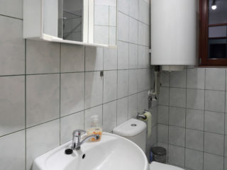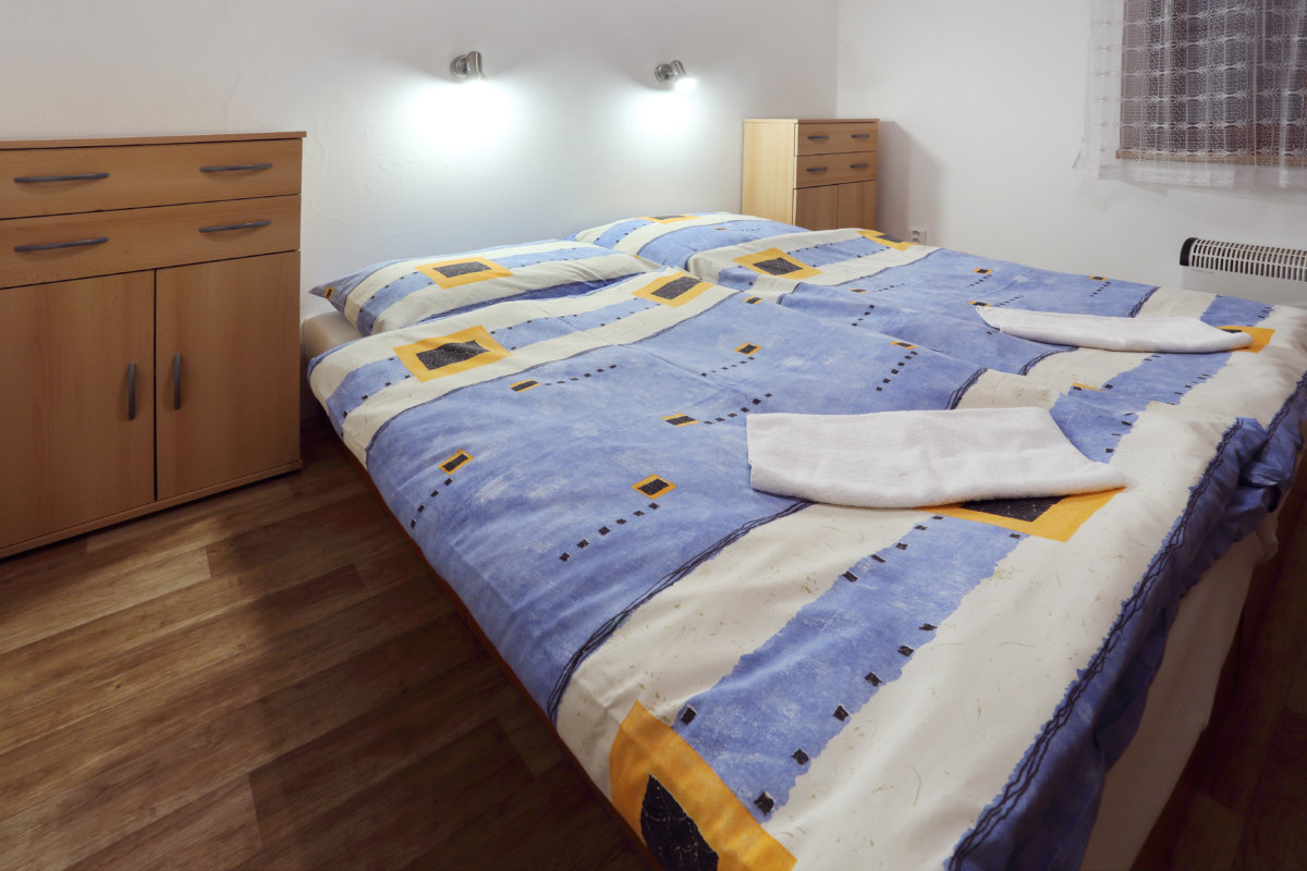 Im Appartement sind zwei getrennte Schlafzimmer (2 und 4 Betten), ein Wohnraum mit einer Kochnische, ein Badezimmer mit einer Duschecke, eine Toilette und ein selbstständiger Raum mit der anderen Toilette. In der Kochnische befinden sich ein voll ausgestatteter Küchenblock (Kühlschrank, Sparherd mit dem Backofen, Schnellkochkanne, Mikrowelle und grundlegendes Kochgeschirr) und ein gro-er Küchentisch, eine Eckbank mit Stühlen. Ein imaginärer Teiler zwischen dem Wohnraum und dem Speisezimmer ist ein dominanter Kaminofen, der nicht nur diesen gro-en Raum beheizt, sondern mit Hilfe der Belüftungsanlage auch beide Schlafzimmer und das Badezimmer. -ber diesem Ofen gibt es ein geräumiges Hängelager zum Trocknen von einer gro-en Menge nasser Kleidungsstücke. Falls die Gäste keine Lust haben, im Ofen zu heizen, gibt es direktbeheizte Körper in allen Räumen. Im Wohnraum befinden sich ein Fernseher und eine gro-e Sitzgarnitur, die zum Doppelbett ausgezogen werden kann.